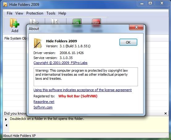 * Hide Folders 2009 will not hide your Windows, Windows System folders and Windows partition root folders - so careless using of Hide Folders 2009 would not bring the system down.